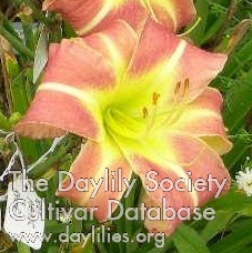 | Description : cream white with pink undertones and small ruffled white edge above chartreuse throat | |