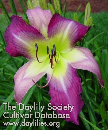 | Description : triangular pinched pale lilac bitone with a green throat and a large ivory watermark that covers two tiers of the petals | |