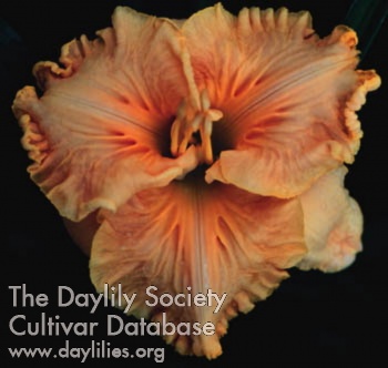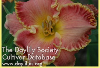 | Description : relief sculpting sometimes as deep as one-quarter inch, baby pink, heavily ruffled, looping gold edge above a lime green throat, pod and pollen fertile | |