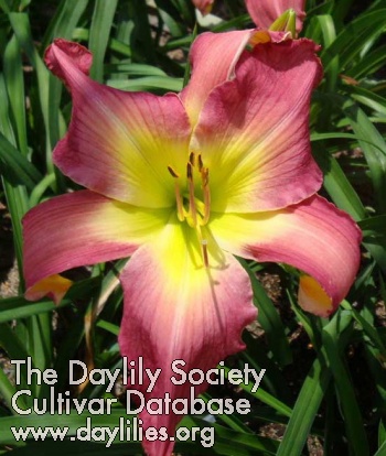 | Description : lavender base color, bud builder, with a very large yellow to white watermark, green throat, recurves from a 9 inch wingspan, and is very fertile setting pods easily | |