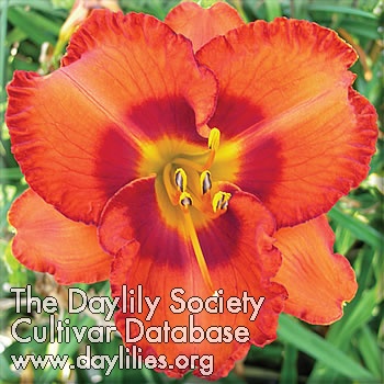Description : orange red with huge dark red burgundy eye and edge above yellow throat