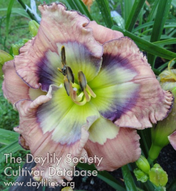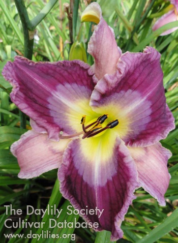 | Description : Bicolor with lavender petals, bluish purple eye, petals surrounded by a thick white border, cream white sepals, dark green to yellow throat near eye. | |