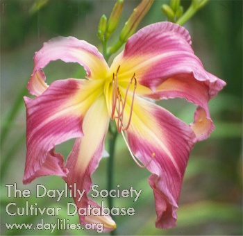 Description : maroon pink with a deep purple maroon eyezone above a very green throat, sepals are edged cream pink for a reverse bicolor; extremely ruffled