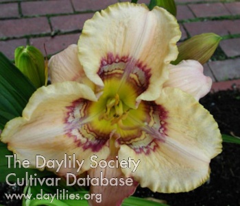 | Description : ivory beige petals, very large violet plum and purple pattern eye, carried onto sepals, thin picotee edge, large green throat, fertile both ways | |