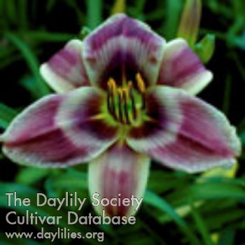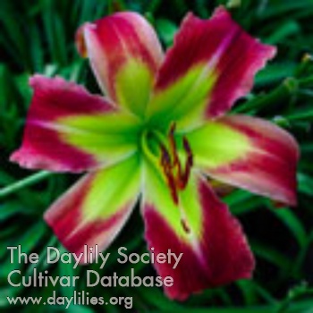 | Description : Maroon purple bitone with lighter white and pink edge on both petals and sepals, patterned eyezone with various shades of pink and white, and green throat. | |