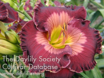 | Description : Cranberry, dark cranberry etched lavender watermark, grape lavender plus ivory edge, green throat. | |